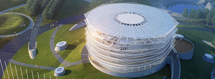 該項目西鄰青島路、東臨綠舟路、南鄰日照植物園,建筑高度34米,建筑面積1.8萬平方米,概算投資2億元??萍拣^設(shè)計中引入"黑洞"和"星空"的概念,作為"黑洞"的中心,所有的場地景觀及道路都圍繞這個中心沿螺旋狀放射形布置,暗示了整個場地的"力的源泉"都來自于科技館。